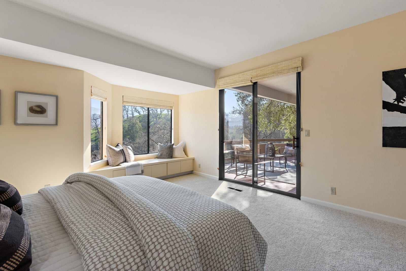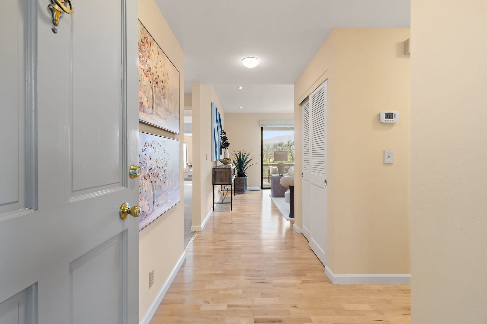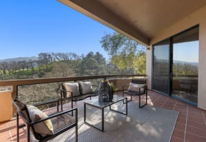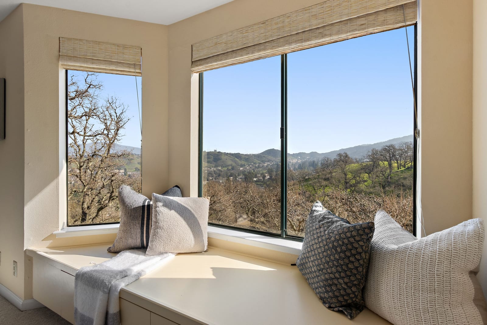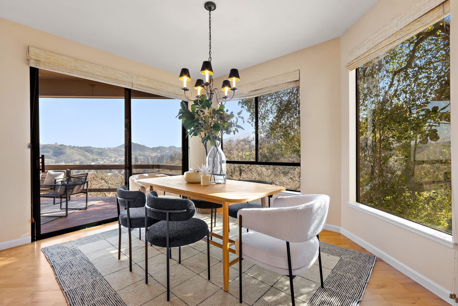 We are proud to present a new Villa Robles model situated in a rare two-story building near the top of Stanley Dollar in Rossmoor. Enjoy fabulous views of the Rossmoor valley, rolling hills, and Mt Diablo from the expansive tiled deck accessible from the Living Room, Dining Area, and Primary Bedroom. This private end-unit condo features a spacious Living Room/Dining Room with a fireplace and spotlight lighting that is surrounded by sylvan views from every window and sliding glass door. The large Kitchen has an abundance of cabinets and counter space as well as a passthrough to the Living Room and a with a cozy breakfast nook for informal meals. Plenty of desirable updates like smooth ceilings, hardwood floors, new carpeting in the bedrooms, and more. Parking and storage is a breeze with an attached garage with interior access off the Kitchen and a large storage loft. Solar panels on the roof provide great energy savings and the laundry room off the Kitchen has a side-by-side washer/dryer and cabinetry. Spend your mornings enjoying the sunrise over the Rossmoor valley in this special property.