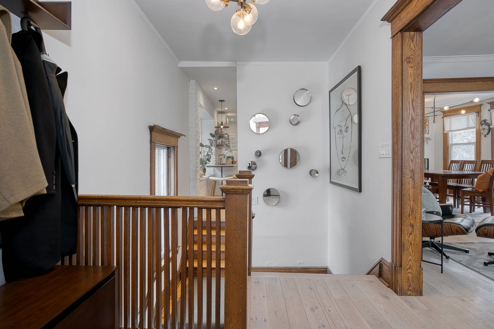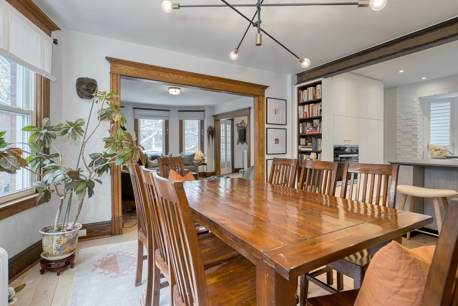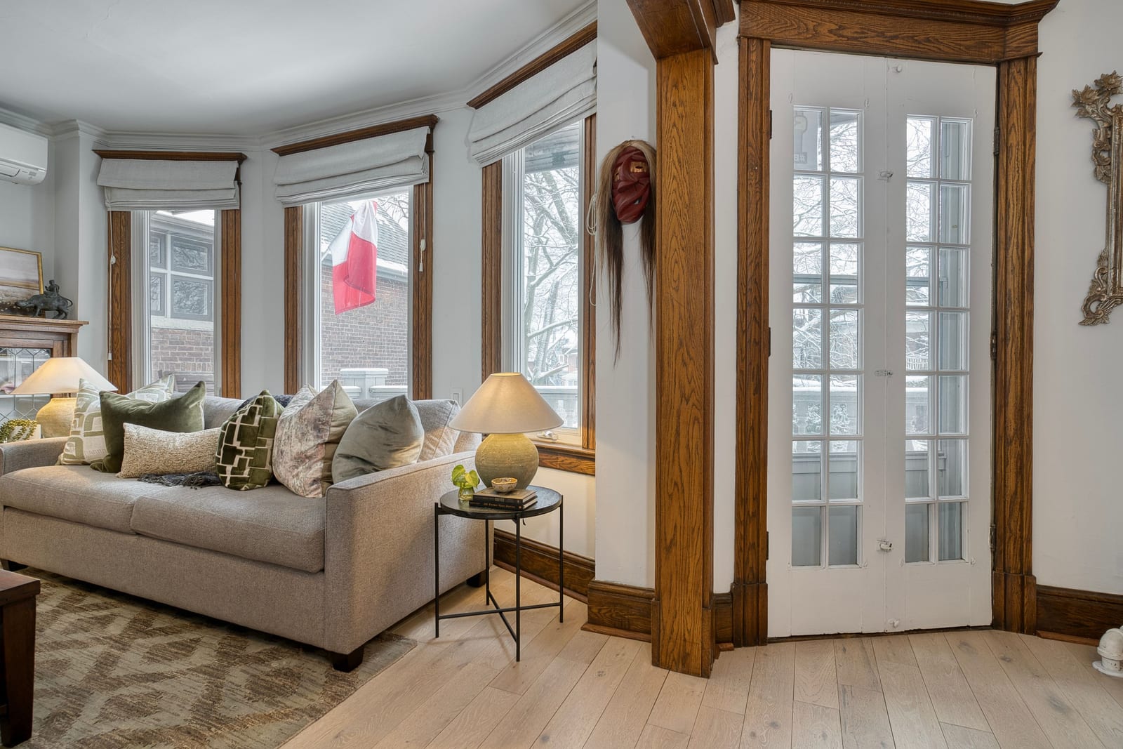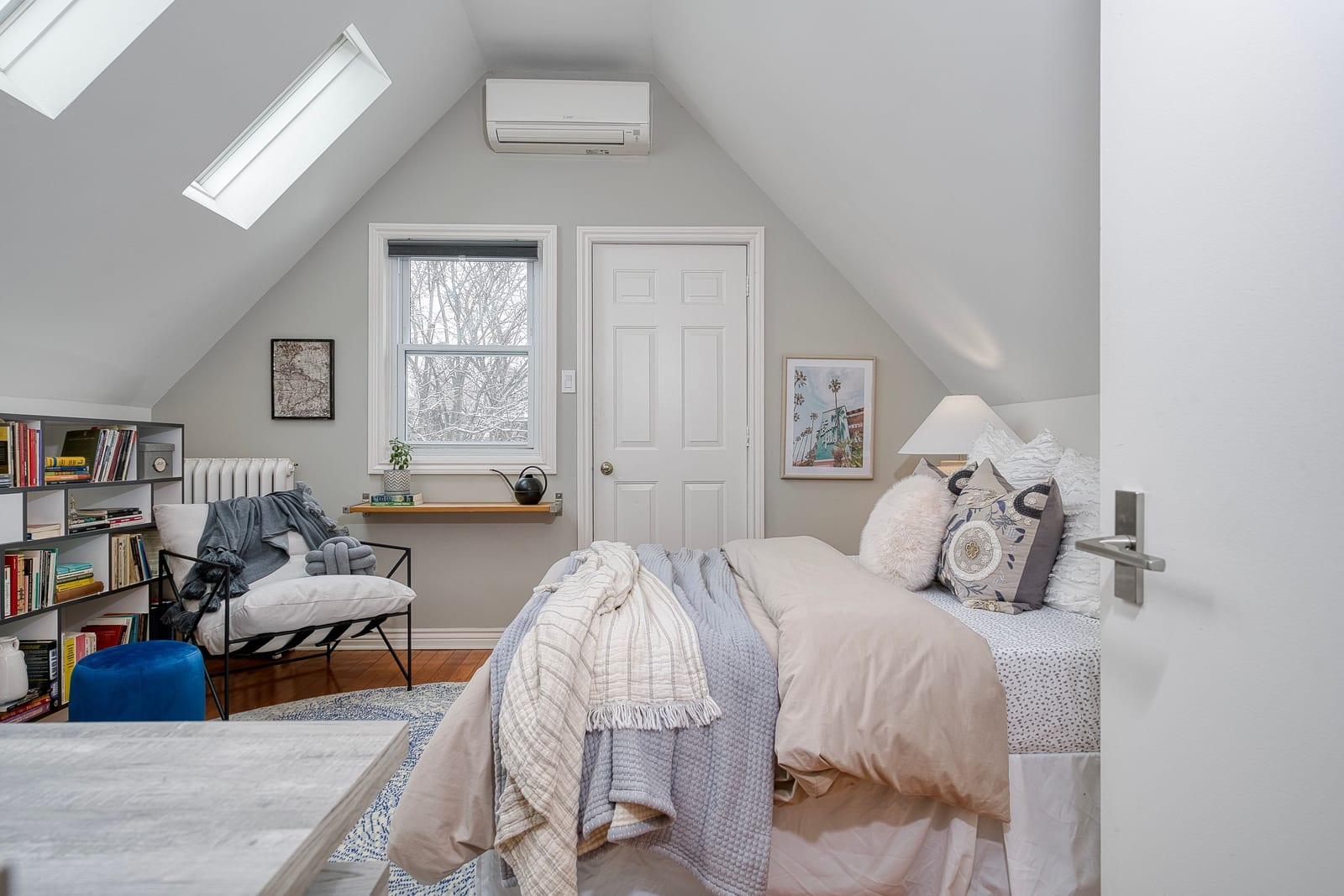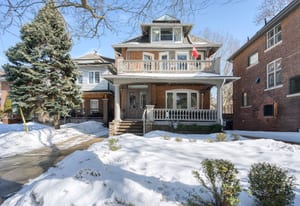 Stunning Arts & Crafts Duplex in High Park! This exquisite detached residence blends timeless architectural character with exceptional modern design, offering approximately 4,200 sq. ft of finished living space across three levels plus a beautifully renovated basement suite. An extraordinary opportunity for multigenerational living, premium rental income, or an expansive owner’s retreat. The main floor showcases classic Arts & Crafts detailing, including original built-ins with leaded glass doors, rich wood trim, and an ornamental fireplace in the formal living room. A separate formal dining room enhances the home’s elegance, while two spacious bedrooms—one ideal as a sunroom or office—and a renovated 4-piece bath complete this level. There are 2 ductless A/C units that cool this main floor unit. The upper suite, spanning the second and third floors, has been fully renovated and thoughtfully designed by renowned Felix Leicher of Baukultur. The chef-inspired kitchen features a large island, integrated appliances (Miele oven and island cooktop), and a walk-in pantry, flowing seamlessly into open-concept living and dining spaces with original woodwork, custom cabinetry, and a gas fireplace. This level also includes two generous east-facing bedrooms with wall-to-wall windows, a powder room, a large laundry room, and abundant storage. The third floor offers two additional spacious bedrooms, including one with a walkout to a private tree-top balcony. The luxurious primary suite impresses with cathedral ceilings, floor-to-ceiling windows, wall-to-wall built-in dressers, and a spa-like 5-piece ensuite. A skylit family room, serene meditation space, additional powder room, and extensive closet space complete this remarkable level. Hardwood floors run throughout, and the owner’s suite is equipped with seven ductless A/C units for optimal comfort. The recently renovated basement suite features a separate entrance, quartz kitchen with new stainless steel appliances, stylish 3-piece bath, and generous living and bedroom areas—currently vacant.