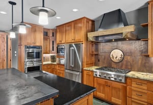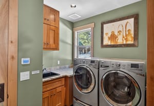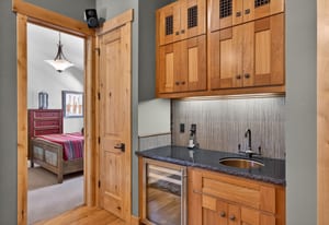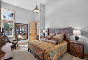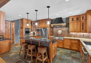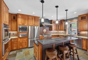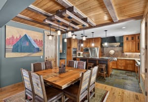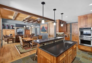 The custom chef’s kitchen features outstanding appliances, including double ovens and a warming drawer, granite countertops, and a generous breakfast bar—perfect for gathering and entertaining. The dramatic dining area and great room with soaring ceilings provide an inviting space to relax after a day on the slopes.