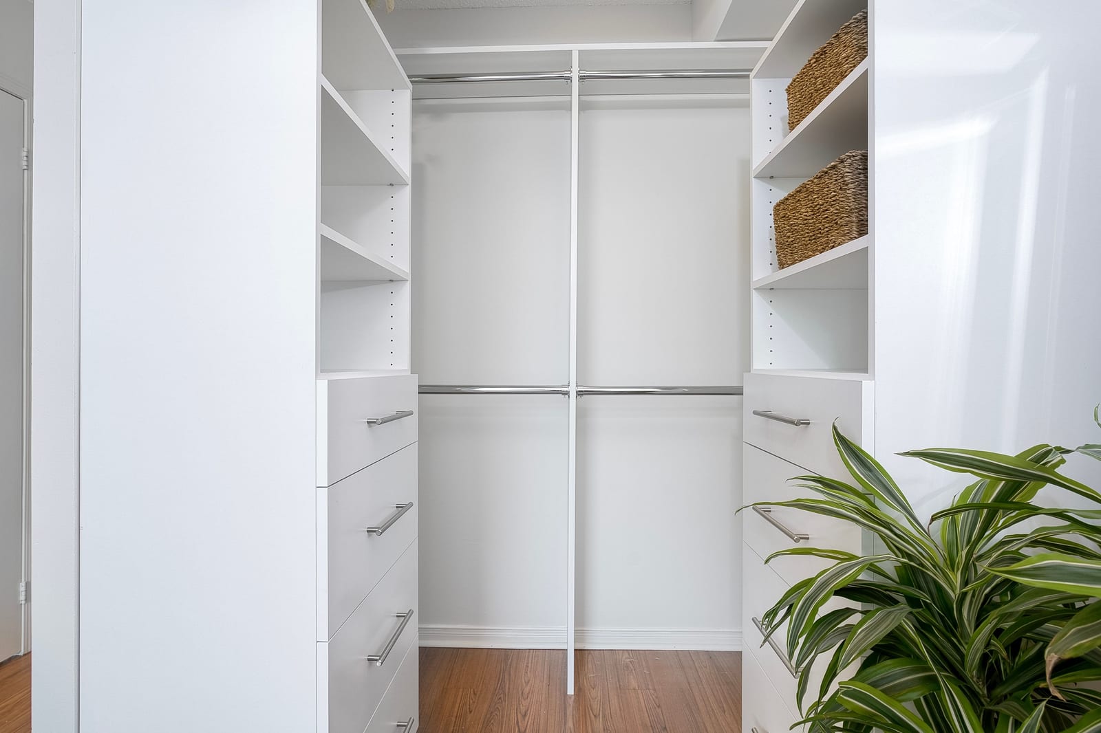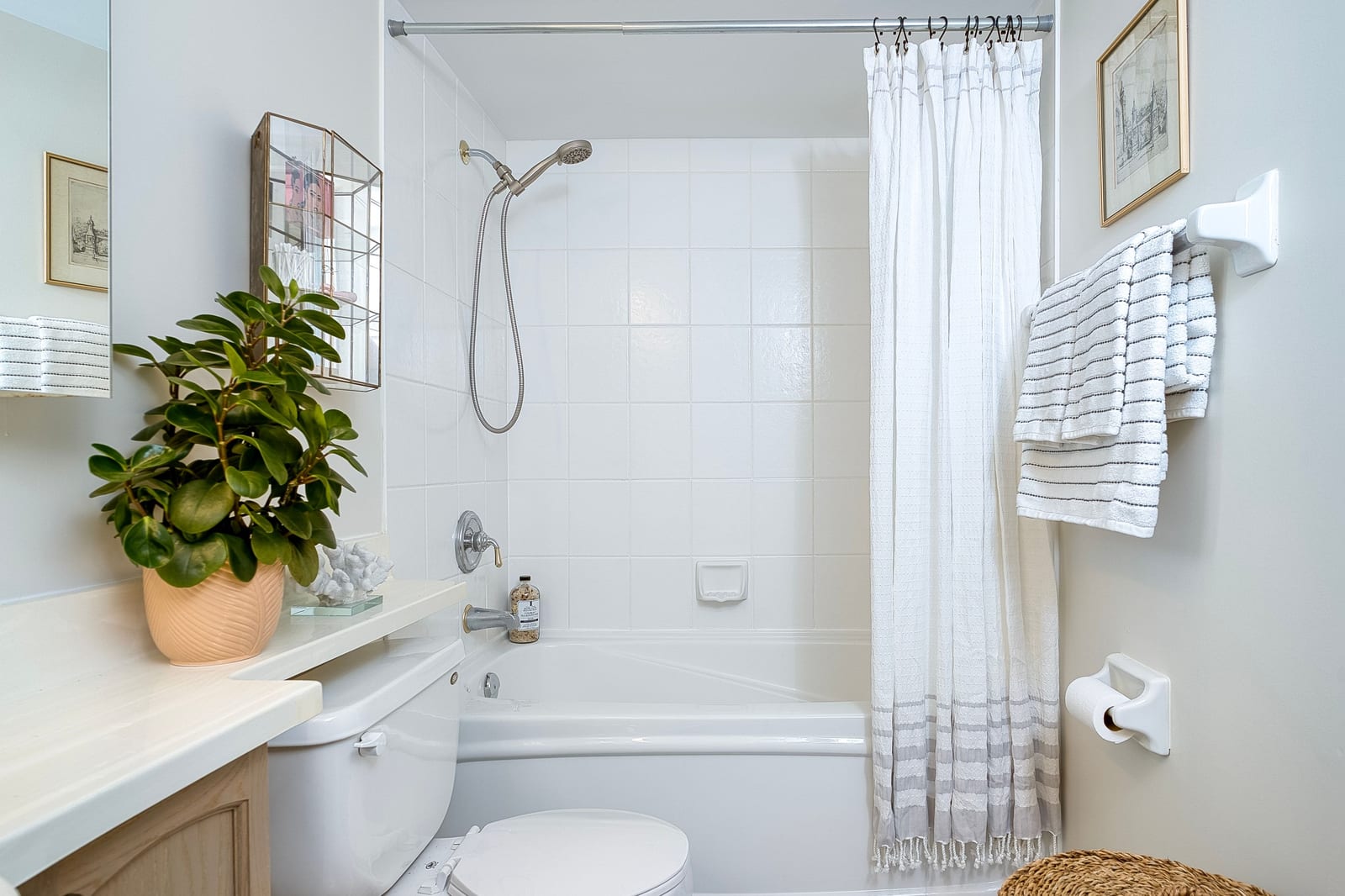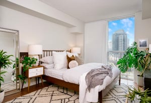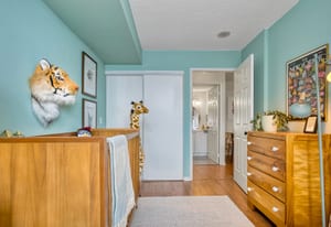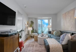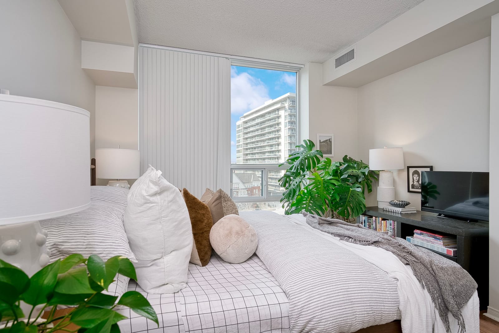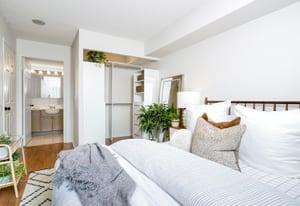 Inside, the thoughtfully designed split-bedroom layout provides privacy, with each bedroom positioned on opposite sides of the unit and featuring its own full bathroom—ideal for roommates, guests, or working from home. The updated kitchen features modern quartz countertops and a stylish backsplash, while both generously sized bedrooms include double closets and lovely west-facing views. The primary suite offers a four-piece ensuite and a custom closet organizer installed in 2024, adding practical storage and organization. Window blinds installed in 2025 provide comfort and privacy throughout the home.