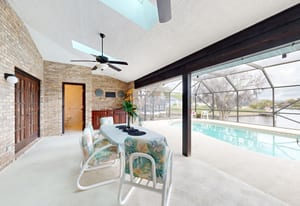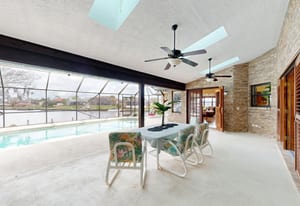 Step outside to the screened pool enclosure overlooking the canal, perfect for relaxing or entertaining. The spacious covered brick lanai features skylights, ceiling fans, and a built-in serving/grilling area, creating a comfortable outdoor living space year-round.