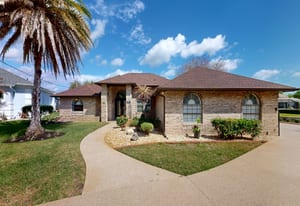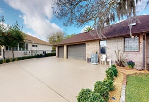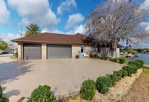 A private electronic driveway gate welcomes you into the property where a sealed driveway with warranty leads to an oversized turnaround area overlooking the canal. The home’s brick exterior and well-maintained landscaping with decorative stonework and lighting create inviting curb appeal both day and evening.