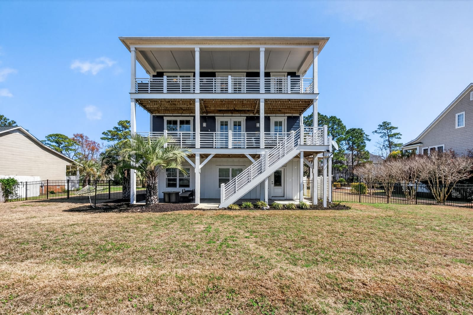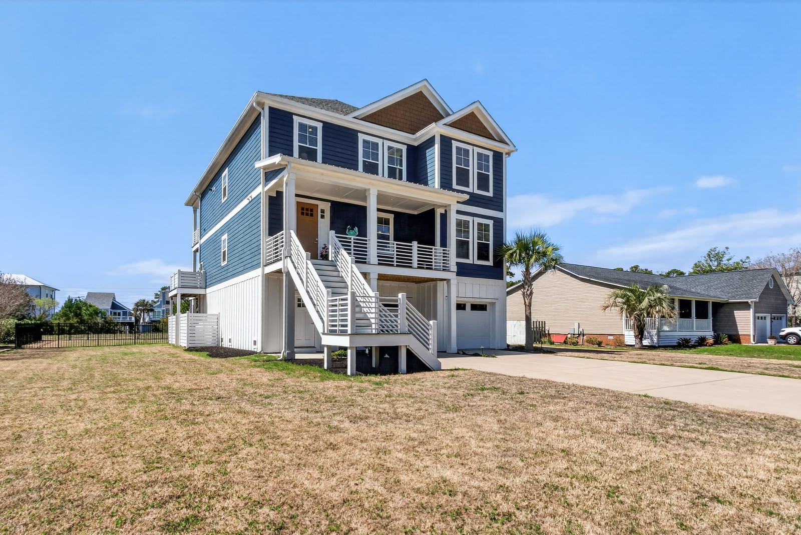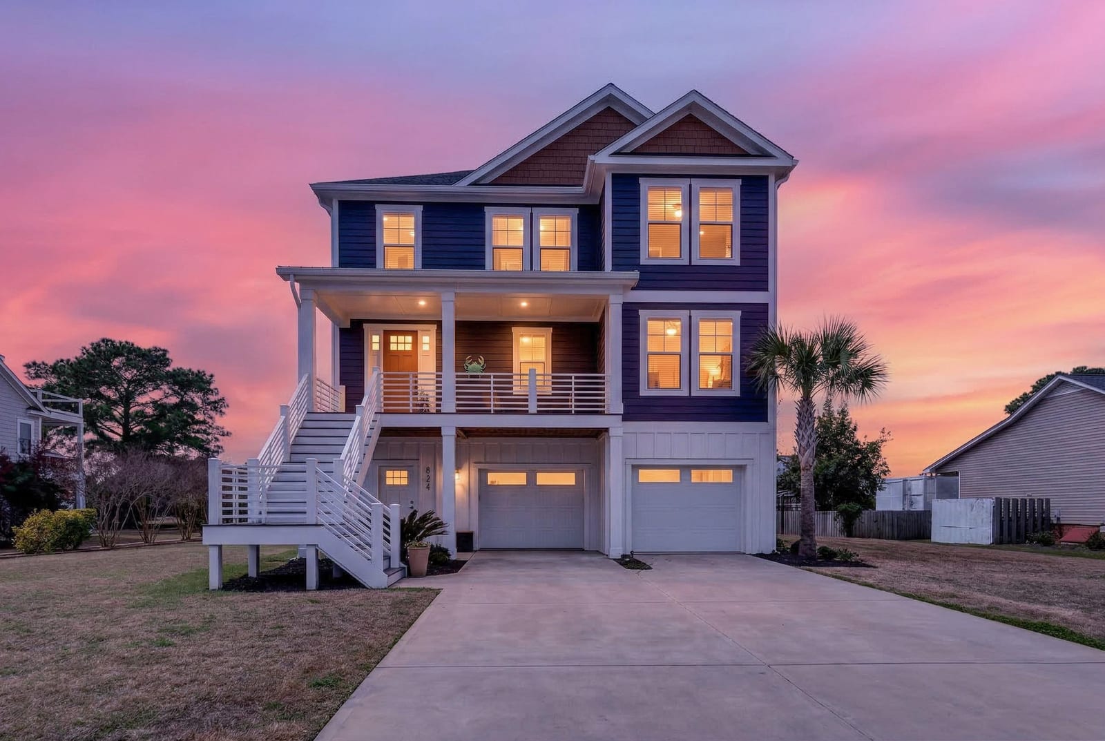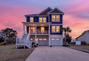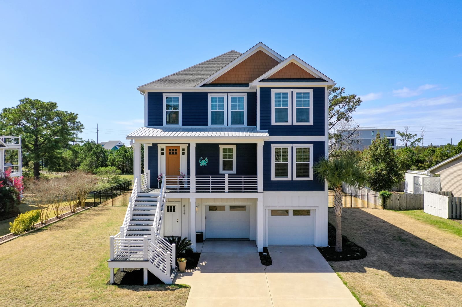 Outdoor living shines with a covered front porch and two spacious rear decks finished with low-maintenance composite decking, along with a concrete patio below--ideal for gatherings, grilling, or enjoying the coastal breeze! The fenced yard offers space for pets, gardening, or play. Additional features include a convenient elevator, irrigation system, generator hookup, and an expansive four-car tandem style garage beneath the home.