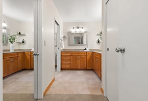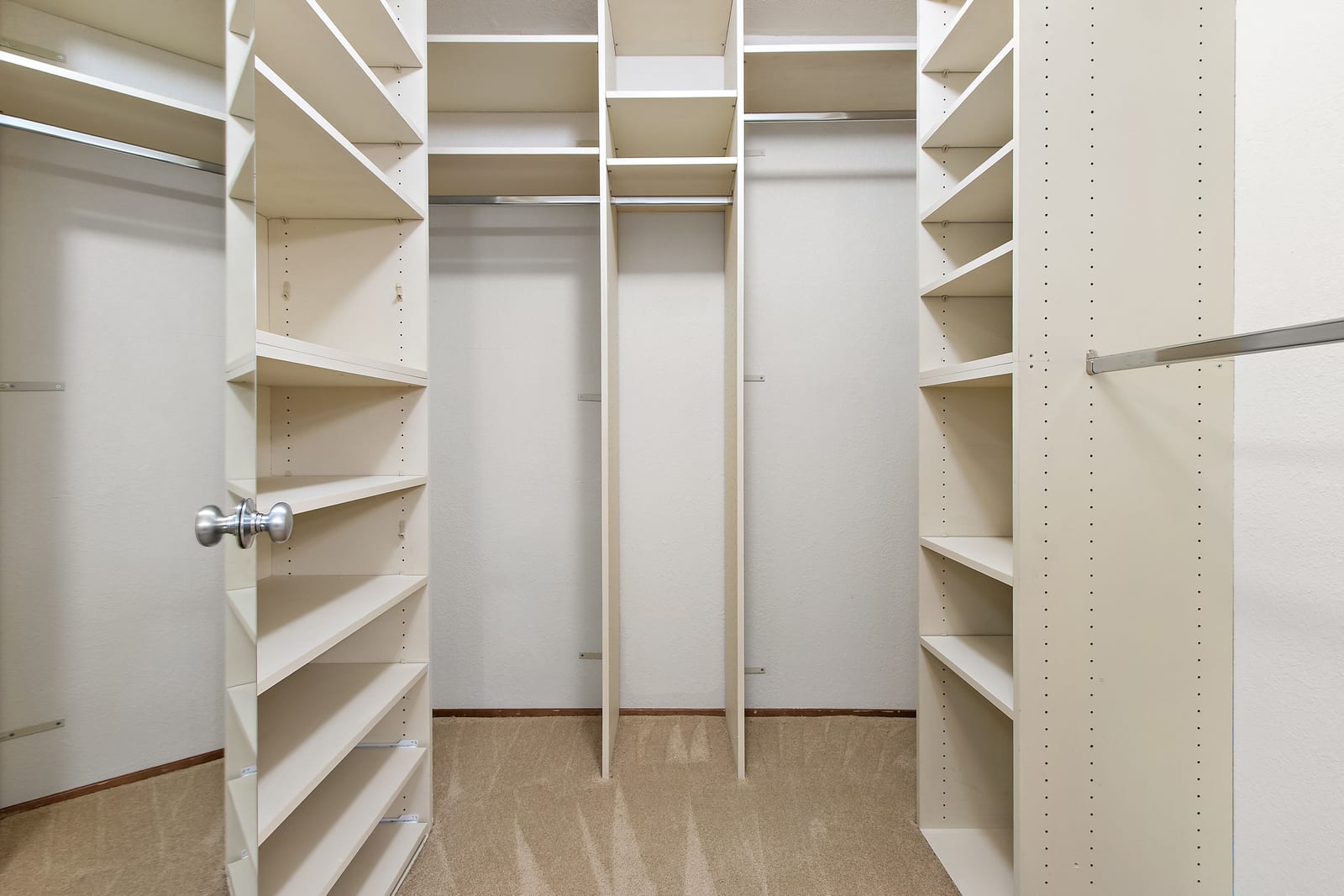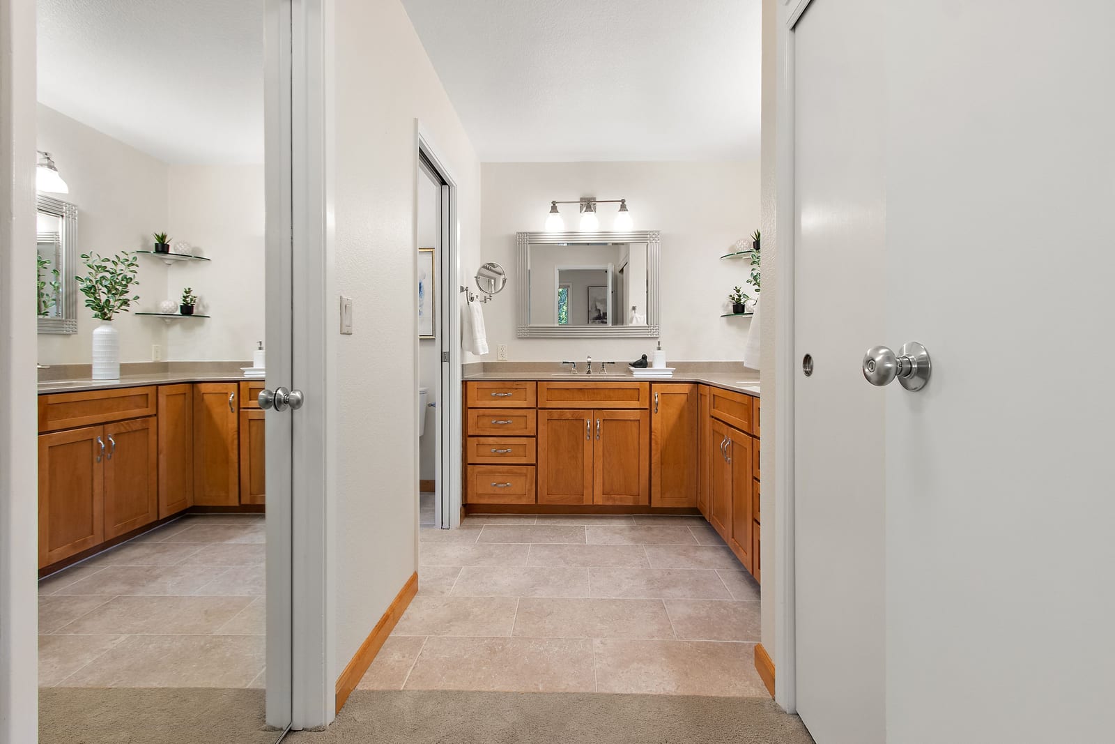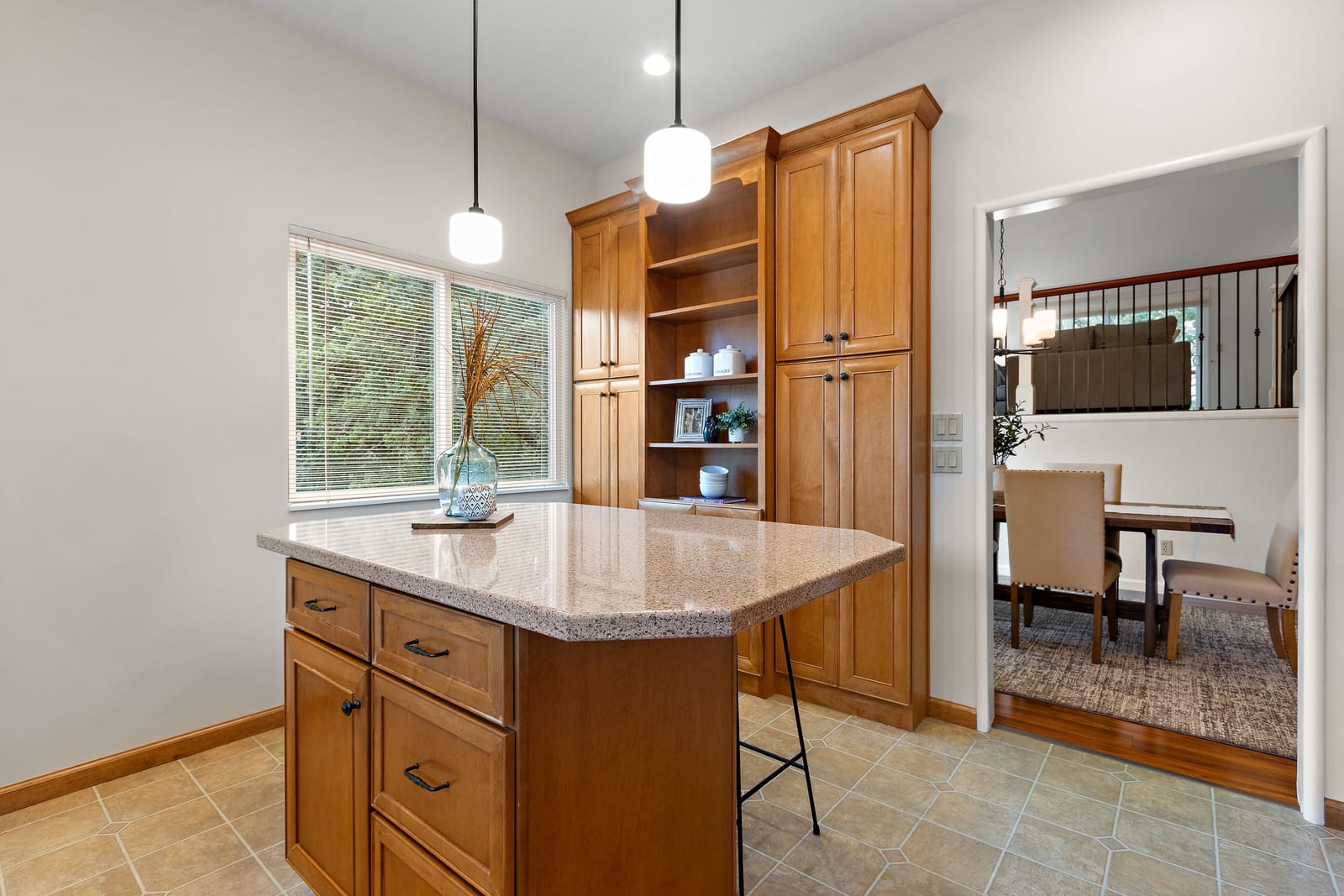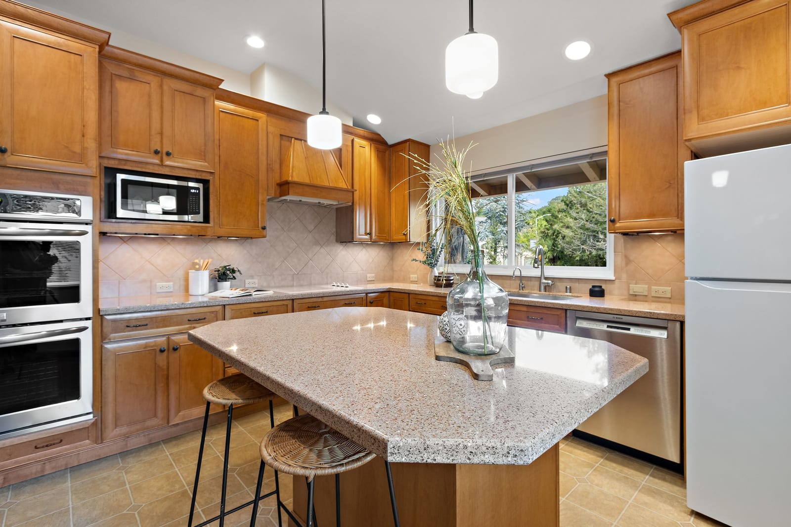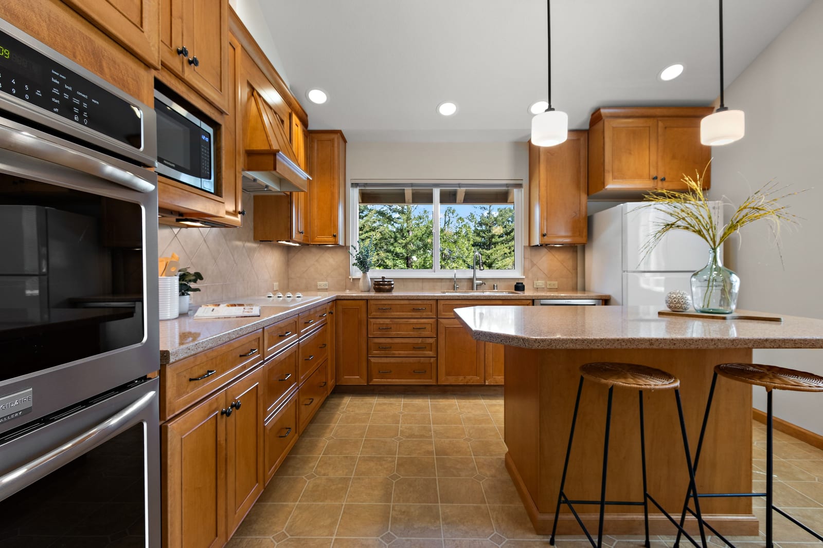 The kitchen is well-equipped with quartz countertops, double ovens, a water filter, and custom cabinetry, along with an abundance of cabinet space in both the kitchen and bathrooms. Storage is a standout feature throughout the home, including two linen closets and extensive additional storage in the garage—making organization effortless.