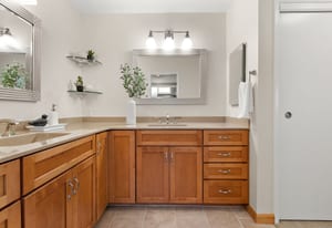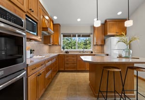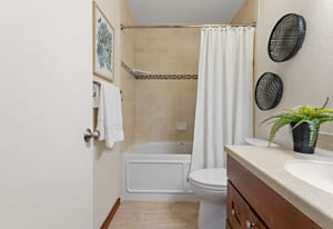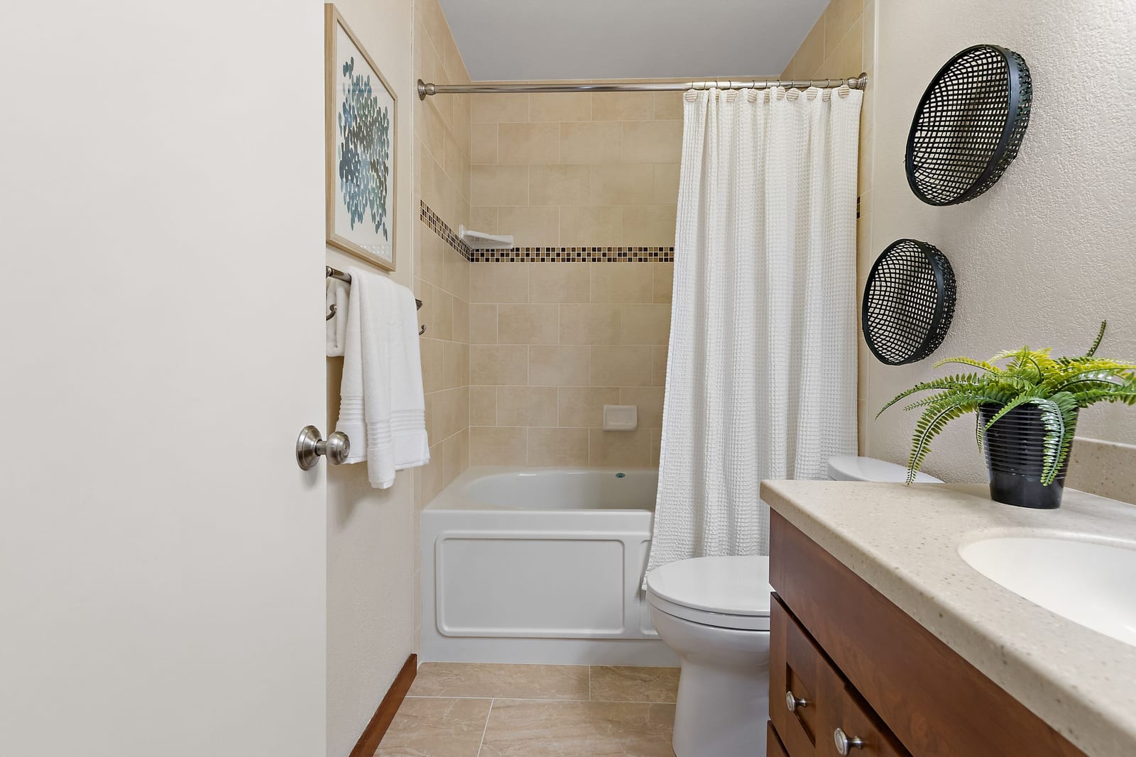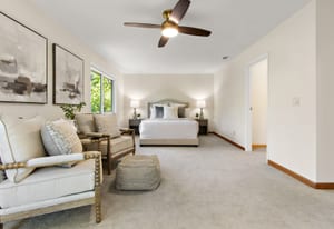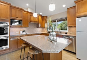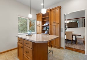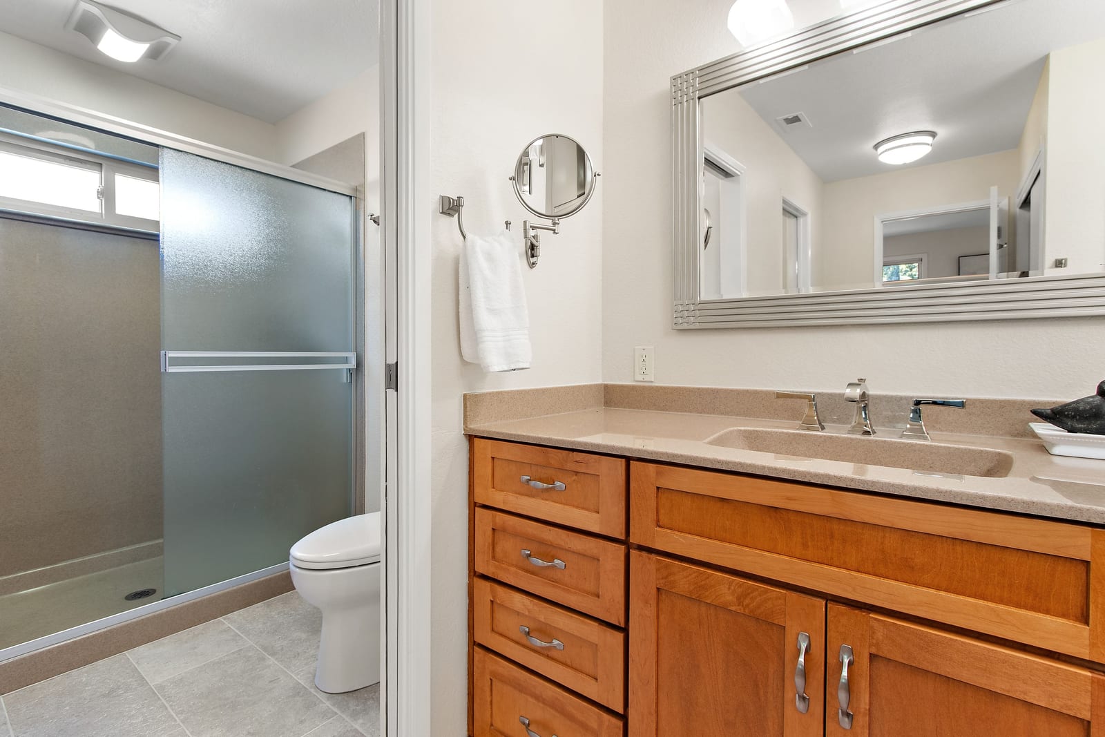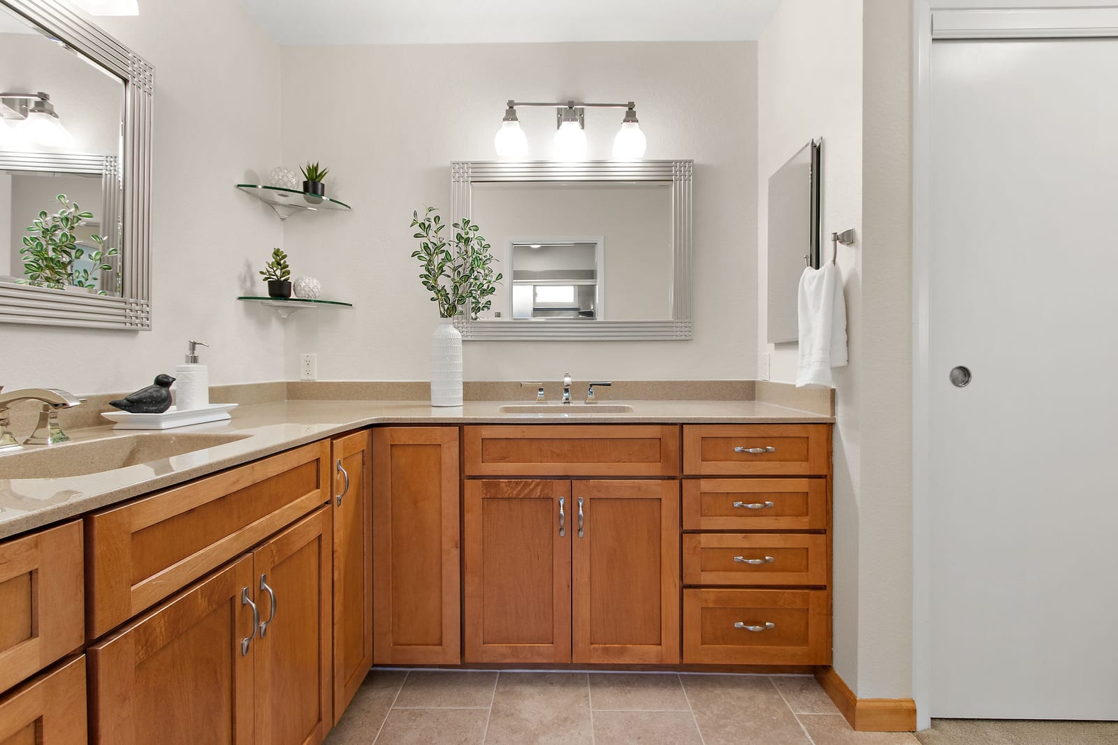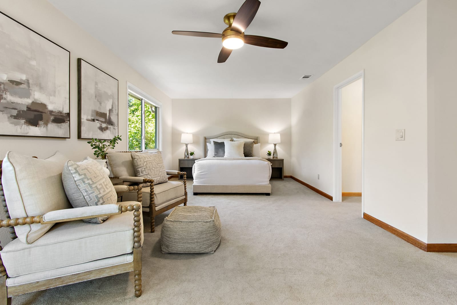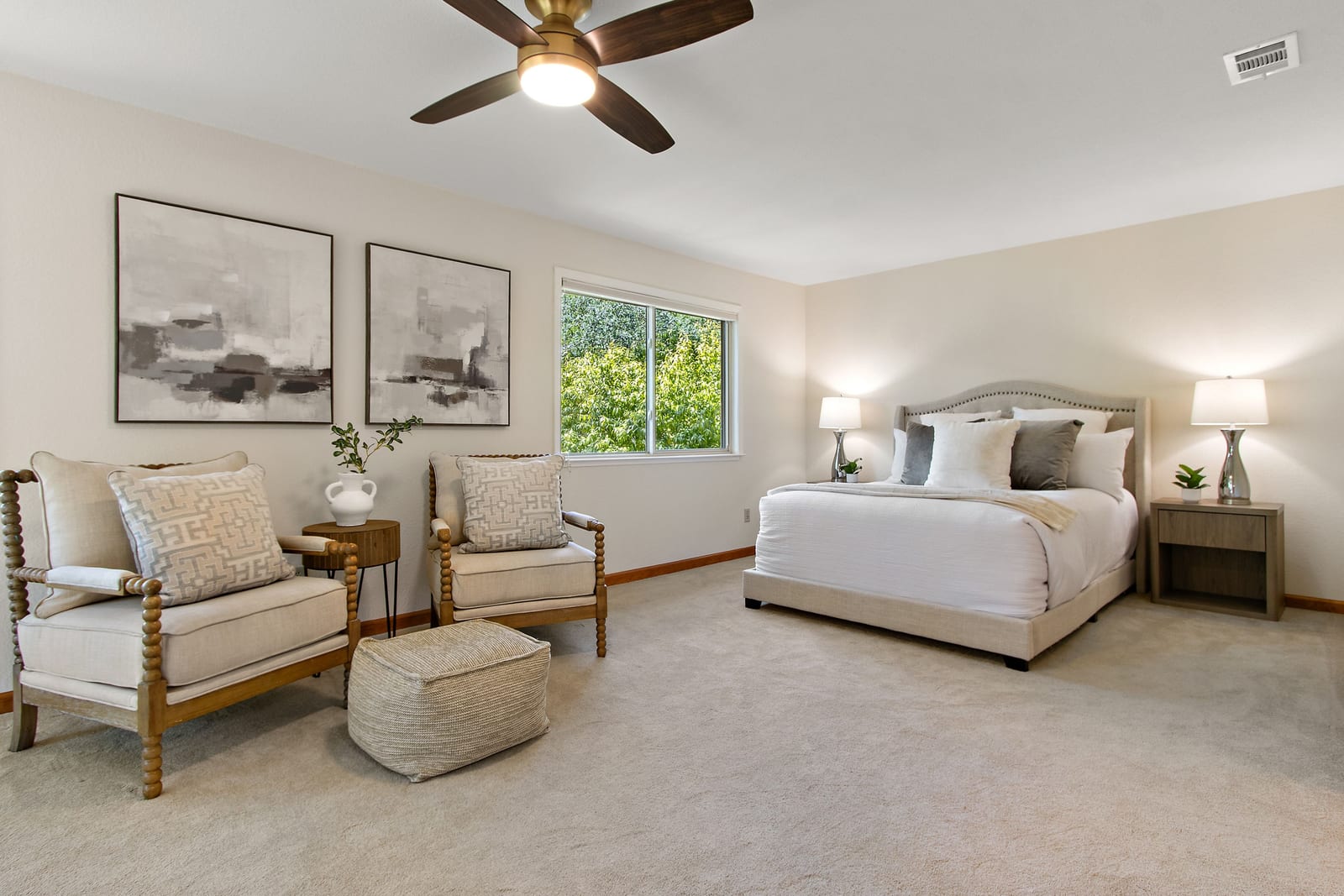 The kitchen is well-equipped with quartz countertops, double ovens, a water filter, and custom cabinetry, along with an abundance of cabinet space in both the kitchen and bathrooms. Storage is a standout feature throughout the home, including two linen closets and extensive additional storage in the garage—making organization effortless.
