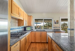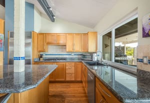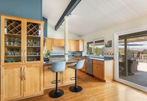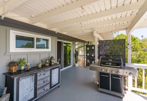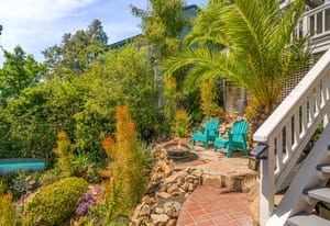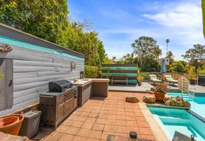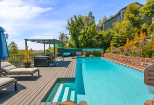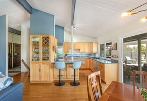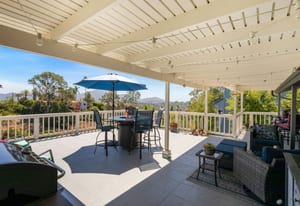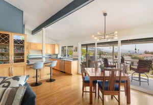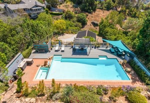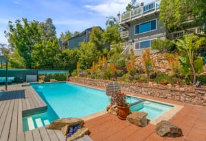 The backyard is an entertainer’s dream with steps down to an oversized solar-heated pool (25’ x 45’), lounging deck, and outdoor kitchen complete with sink, BBQ, and refrigerator. The terraced 1/3-acre lot provides space to garden, unwind, or simply take in the scenery. A haven for nature lovers, the property attracts hummingbirds, blue jays, and seasonal orioles.