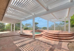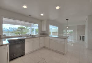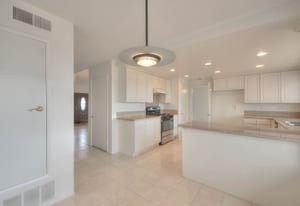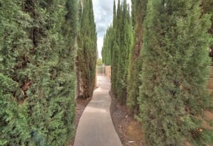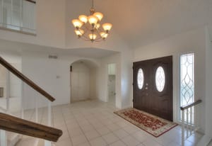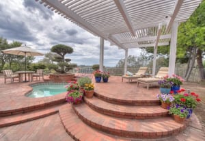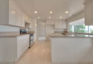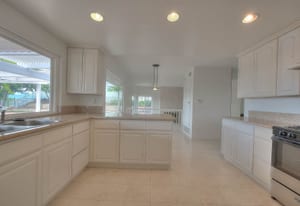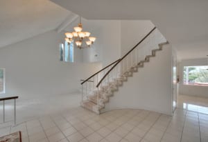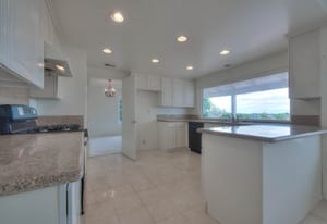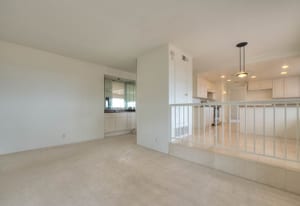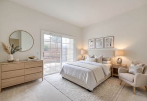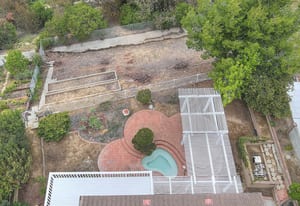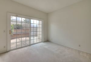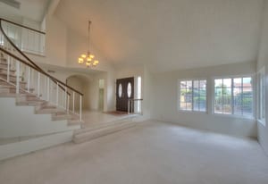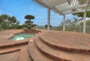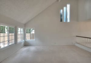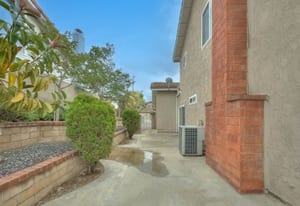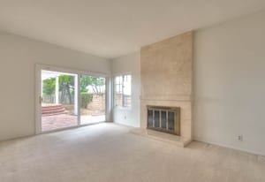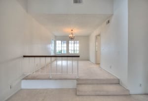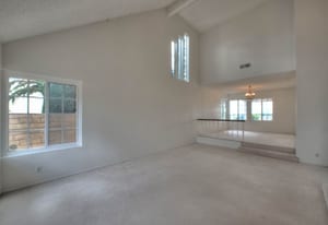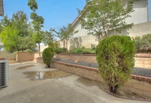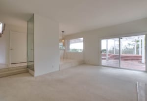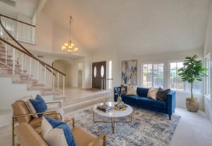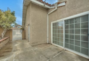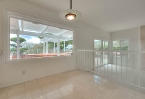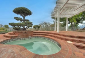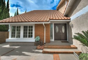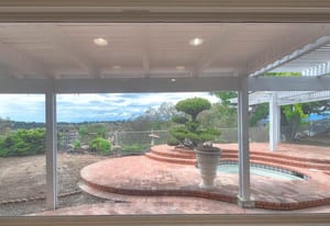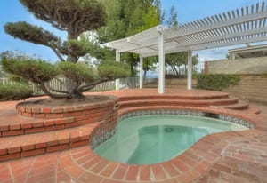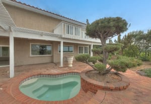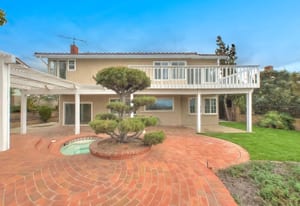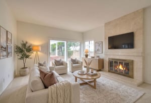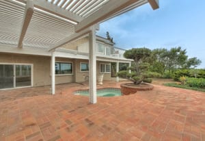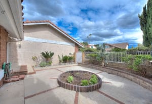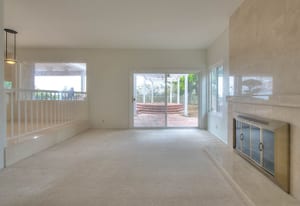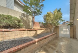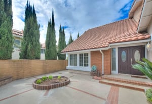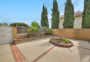 A private front courtyard creates a welcoming entrance, leading into a bright interior with high ceilings and abundant natural light. The home features multiple living areas, including a formal living room, dining room, and a comfortable family room with fireplace.